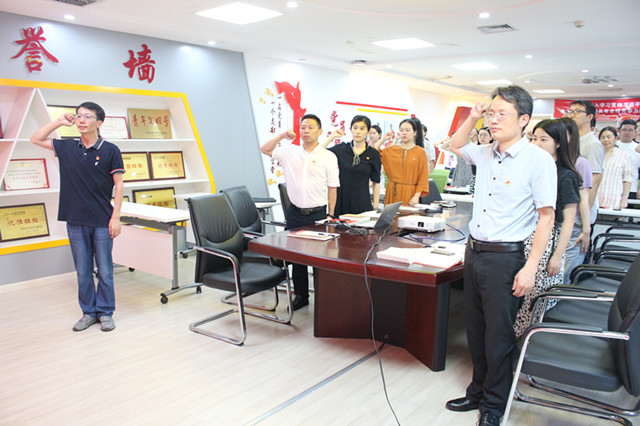 為慶祝中國(guó)共產(chǎn)黨成立102周年,弘揚(yáng)偉大建黨精神,全體黨員在第五黨支部書(shū)記解庭波同志的帶領(lǐng)下,面向黨旗,莊嚴(yán)宣誓,在入黨誓詞中堅(jiān)定理想信念,不斷叩問(wèn)初心、守護(hù)初心,把對(duì)黨忠誠(chéng)的錚錚誓言貫穿工作各方面、全過(guò)程。
