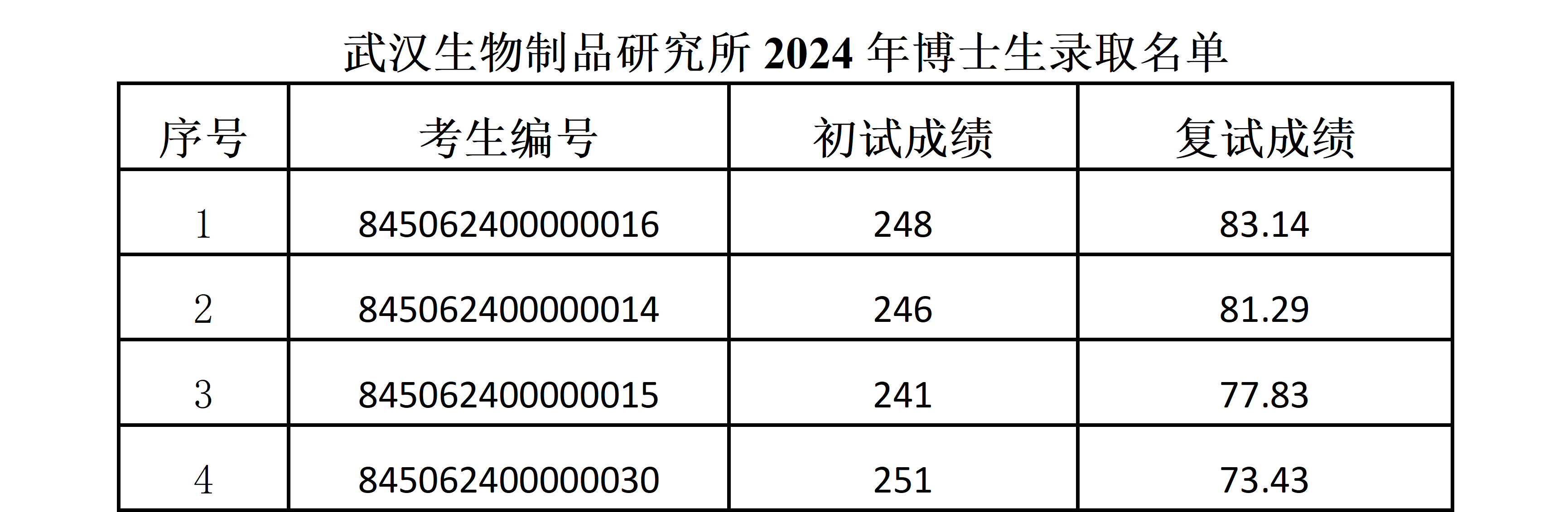 根據(jù)教育部《教育部關(guān)于做好2024年招收博士學(xué)位研究生工作的通知》文件精神,武漢所2024年博士研究生招生錄取名單在官網(wǎng)公示(為保護(hù)考生隱私使用考生號(hào)),公示時(shí)間:2024年5月06日-2024年5月19日。公示期間,考生若有疑問(wèn),可向我所有關(guān)部門(mén)反映。武漢生物制品研究所研招辦及紀(jì)委聯(lián)系方式:
